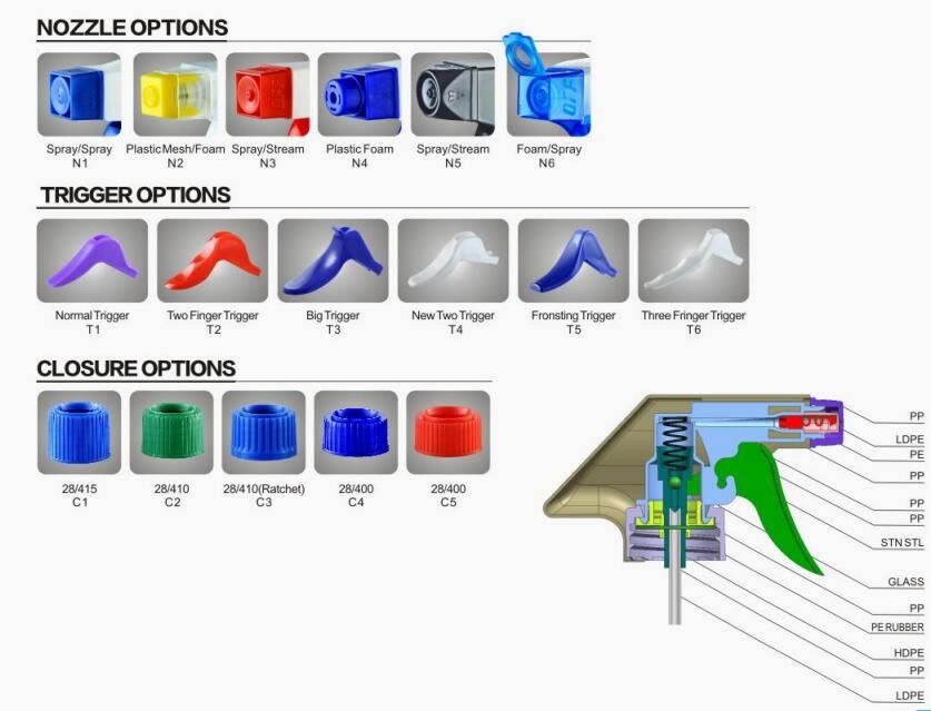 この高品質トリガースプレーヤーは、さまざまなノズルオプションがあります。製品はフォーム、スプレー、またはストリームとして噴霧できます。